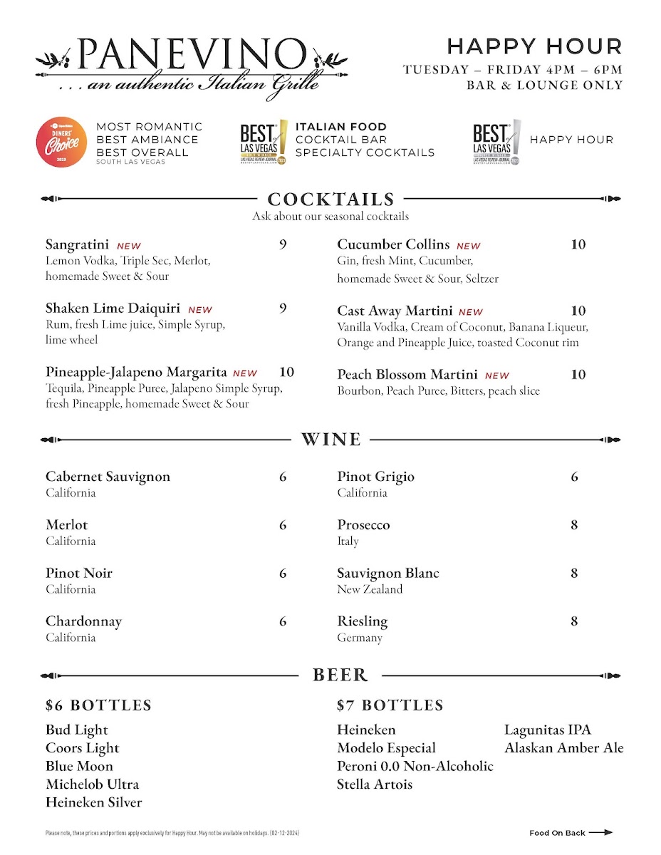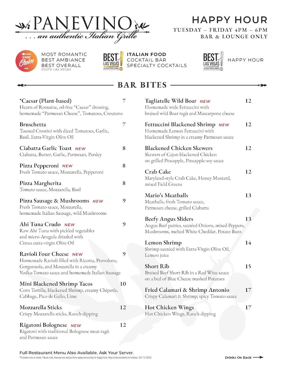 Don’t overlook their vibrant Happy Hour cocktails, featuring creatively crafted drinks like the Apple Cider Old Fashioned, perfect for unwinding after a long day. The ambiance is just as inviting, with stunning views of the Las Vegas skyline that enhance the dining experience. Whether you’re here for a casual meal or a romantic evening, Panevino enchants both palate and soul.